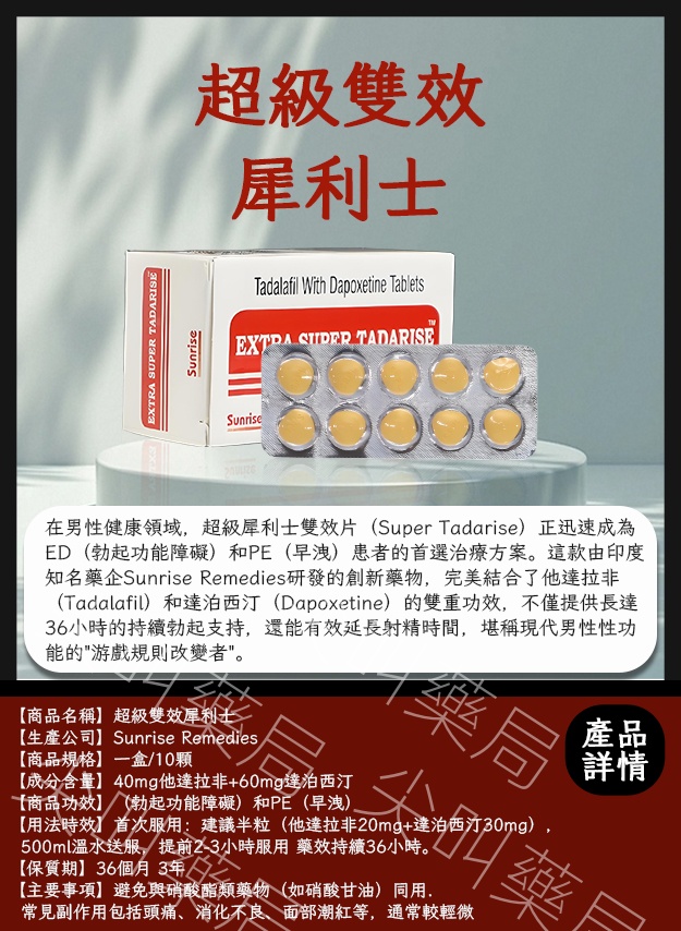 · 他達拉非20mg + 達泊西汀60mg(如印度版 Super Tadalafil)。
