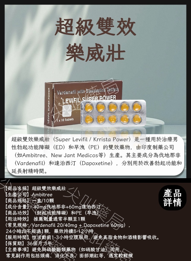 雙效複方藥物,主要成分為 伐地那非 40mg + 達泊西汀 60mg,