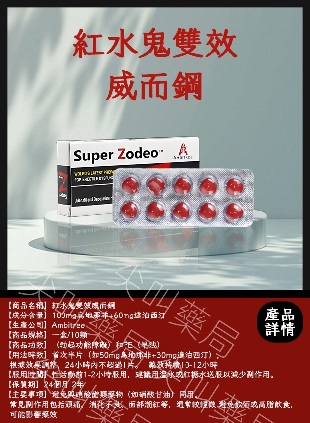 (ED)和早泄(PE)的雙效藥物,由印度Ambitree公司生產。以下是關於該藥物的詳細信息