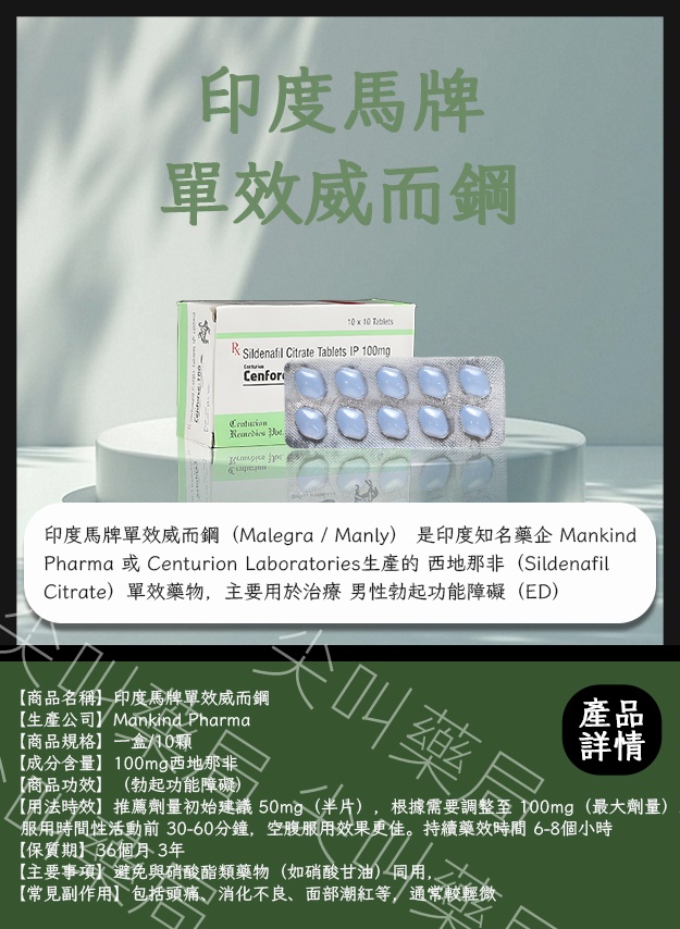 馬牌單效威而鋼(Malegra / Manly) 是印度知名藥企 Mankind Pharma