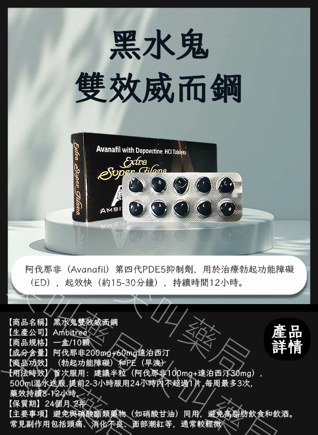 1. 通用名稱:黑水鬼雙效威而鋼(Avanafil with Dapoxetine)